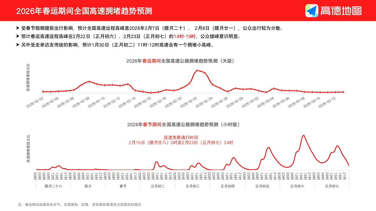 报告预测,今年春运出行将呈现节前节后“双高峰”形态。节前出程高峰预计在2月7日、2月8日(腊月二十、腊月二十一),而节后返程高峰则预计出现在2月22日、2月23日(正月初六、初七)下午。此外,受传统走亲访友习惯影响,正月初二(2月18日)中午时段或将出现短暂的拥堵小高峰。